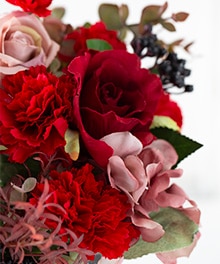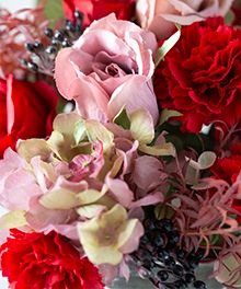 バラとカーネーション、アジサイなどを合わせたアレンジです。